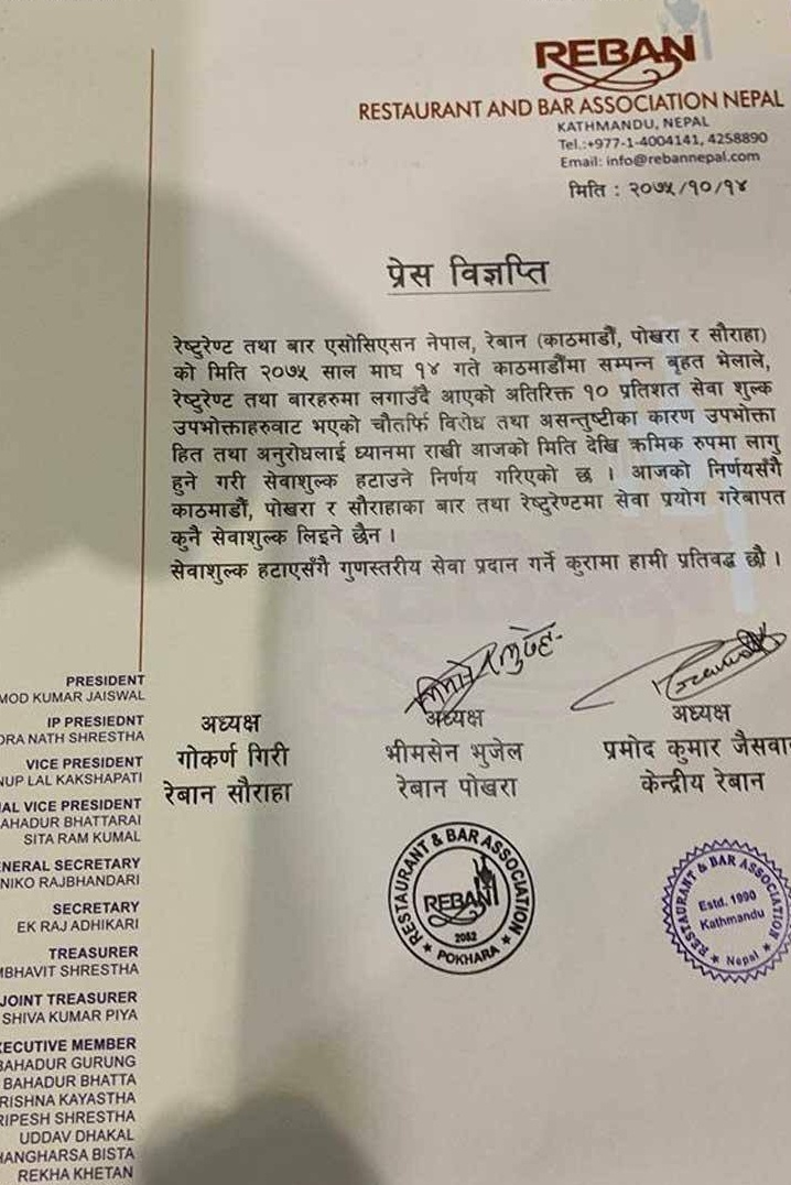 Issuing a press statement, REBAN said that it had decided to withdraw the 10 percent service charge from all restaurants in Kathmandu, Pokhara, and Sauraha and aims to gradually remove the service charge from its affiliates in other districts as well.