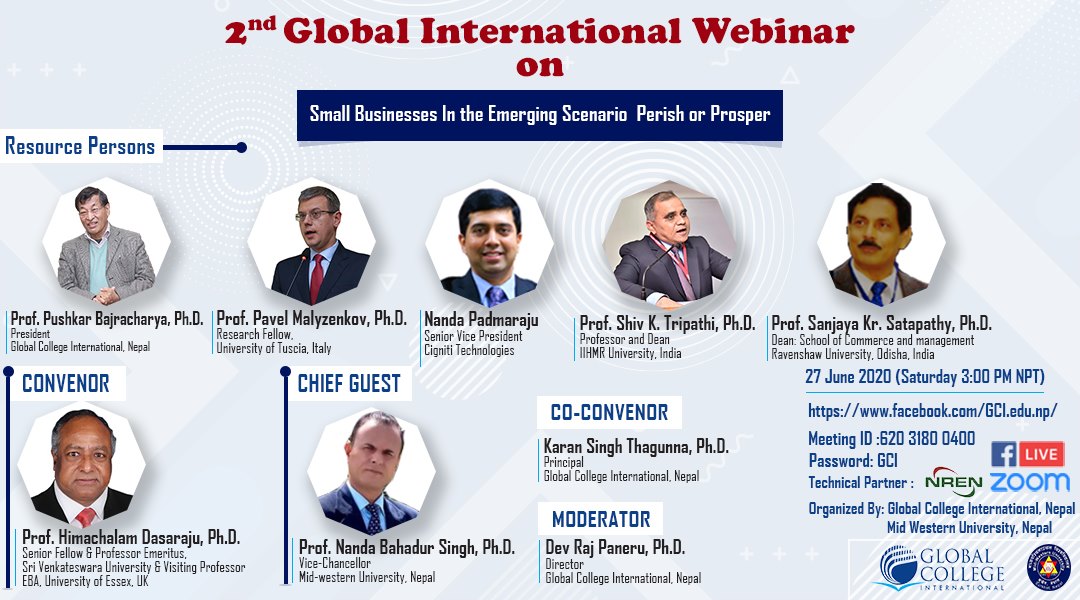 Global College International in association with Mid-Western University is conducting an international webinar. The theme if the web seminar is Businesses in the Emerging Scenario: Perish or Prosper.