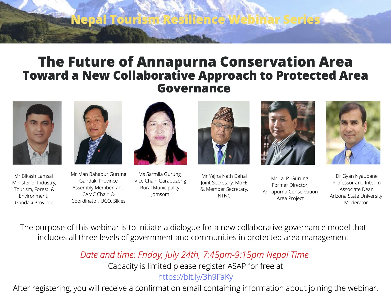 We are pleased to announce our fourth webinar “The Future of Annapurna Conservation Area: Toward a New Collaborative Approach to Protected Area Governance” scheduled for Friday, July 24th, 2020, 7:45pm-9:15pm (Nepal time), 10am EST (USA, Canada).